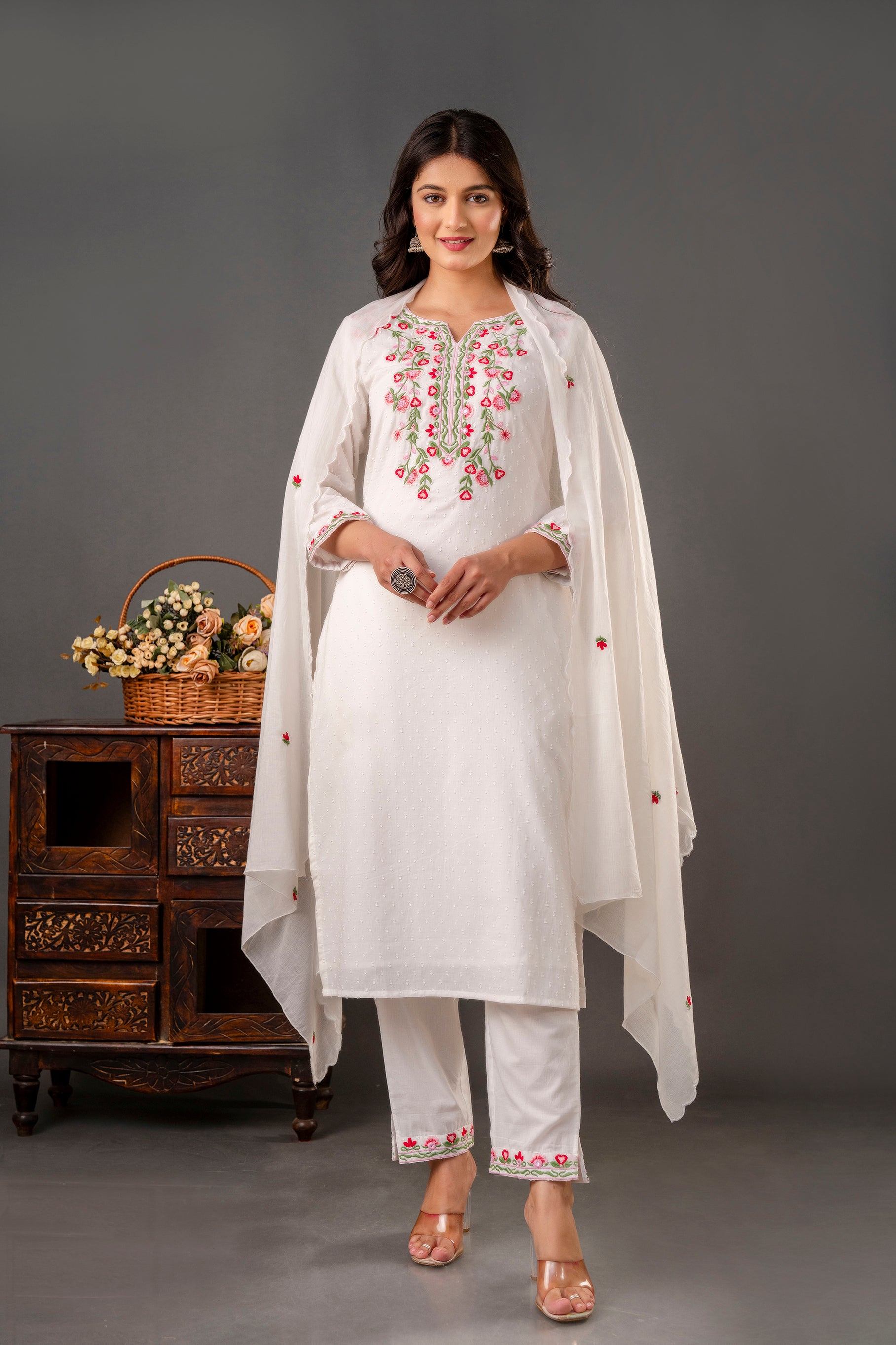 Embroidery on a classic white kurta for a sophisticated look. Made from soft, breathable cotton for all-day wear, 3/4 Sleeve kurta with a Notch neck, straight bottom pants, and a matching dupatta for a coordinated style.