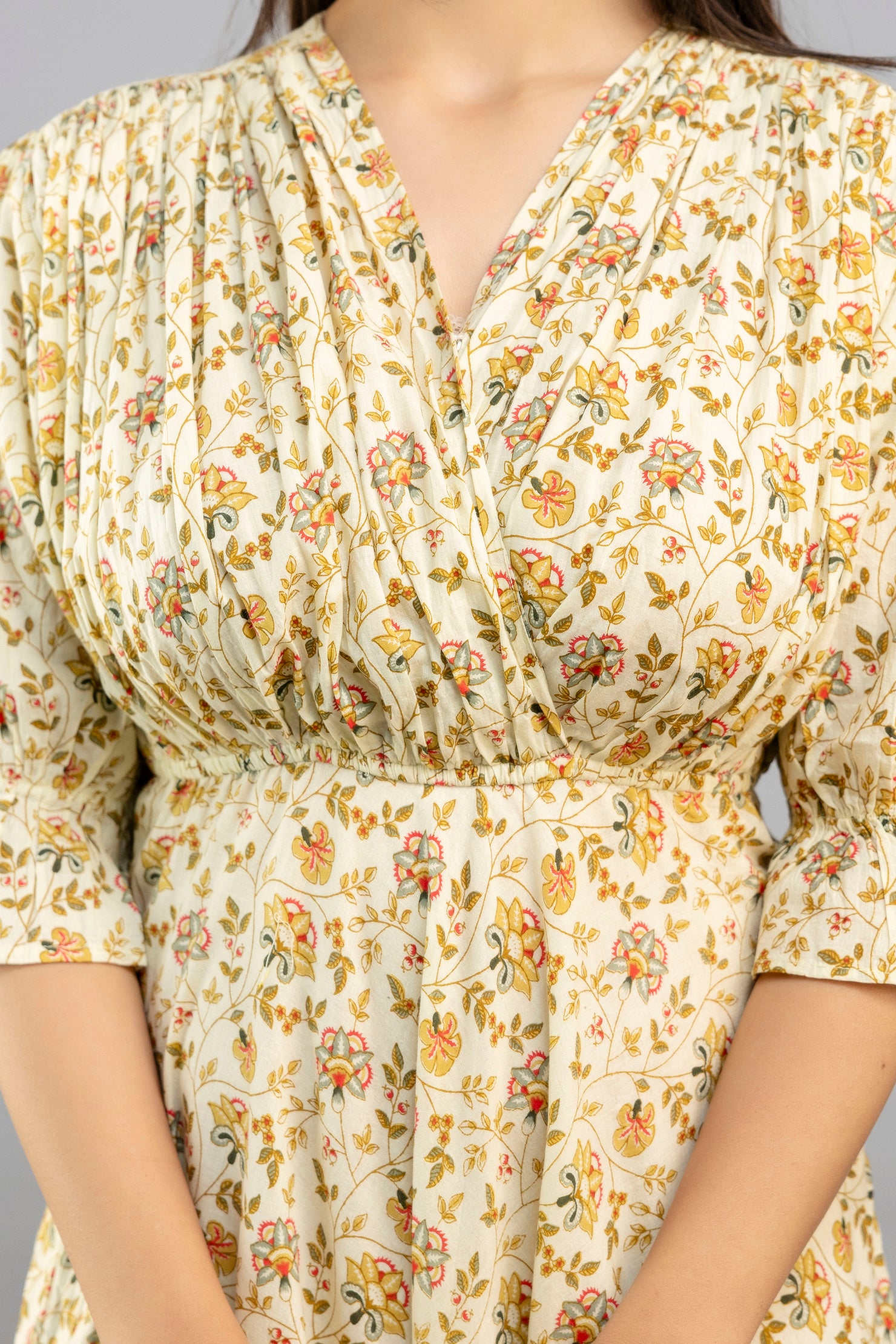 Discover effortless elegance with Sakanya Fashion's Women's Floral Gown Beige Midi/Calf Length Dress. Crafted from pure, breathable cotton, this dress offers supreme comfort without compromising on style. The flattering V-neck design and practical half sleeves make it a versatile choice for any occasion, from casual outings to more dressed-up affairs.